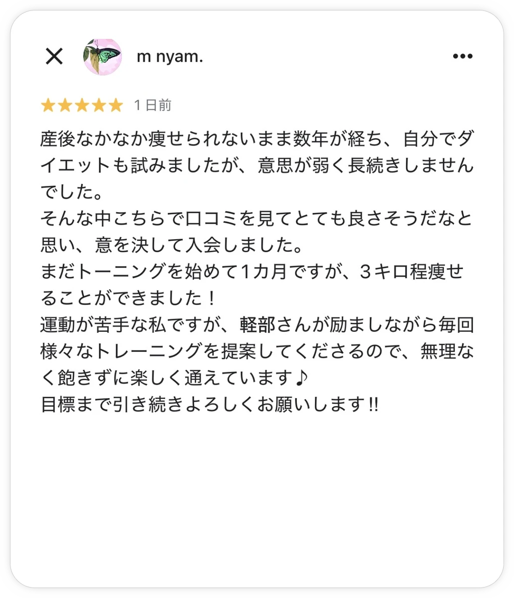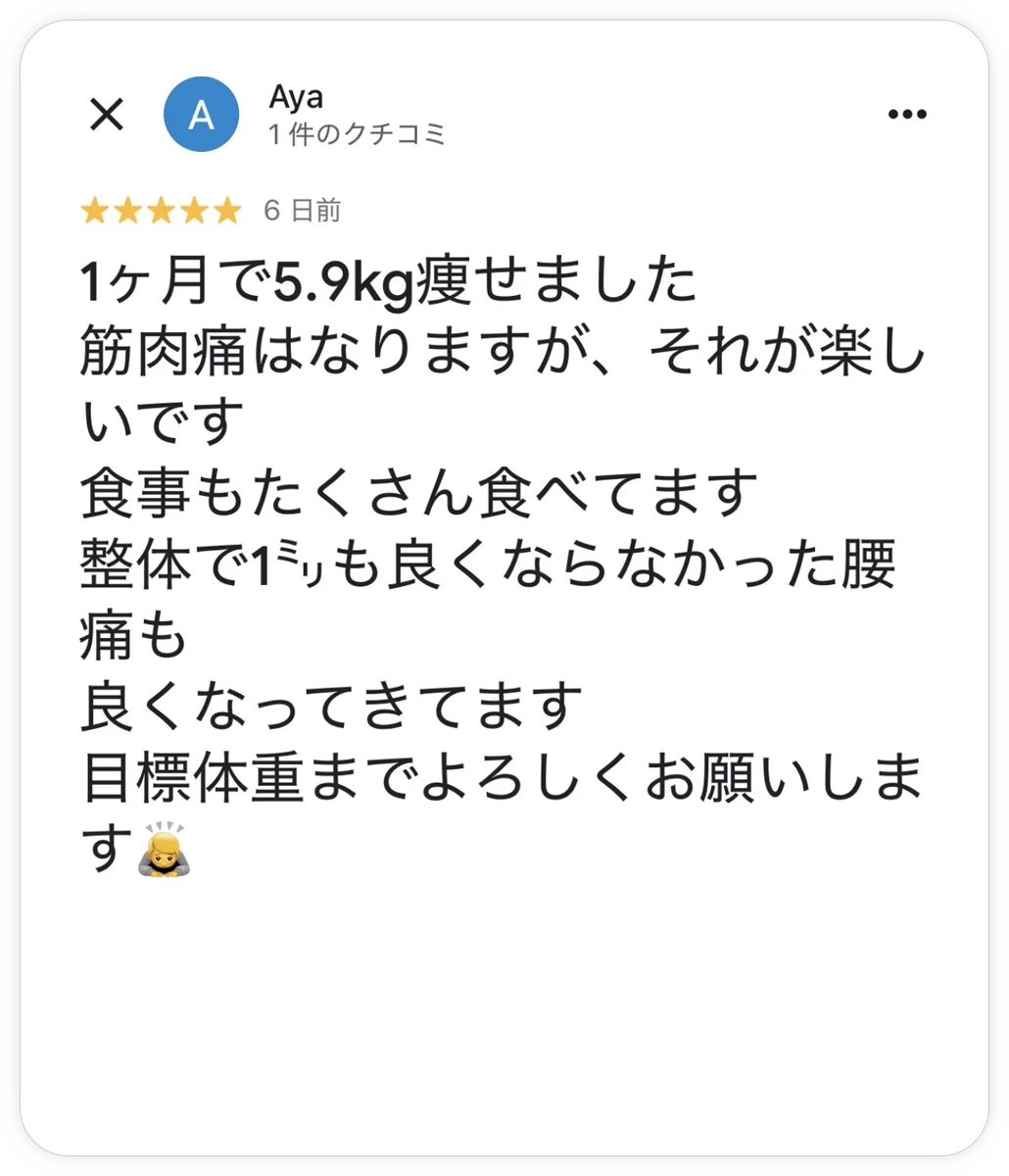 A、もちろんです!!筋トレやスポーツジム、ランニングやヨガを始めても【三日坊主】で終わった。。【モチベーションが続かない】。。そして、結局結果がでない。はっきり言います!!一人で痩せられるのはほんの一握りの方だけです。だからこそ、あなたは一人で頑張らないで下さい。すべて我々にお任せください。あなたが【最短】で痩せる方法を知っていますのできっと継続したくなります!