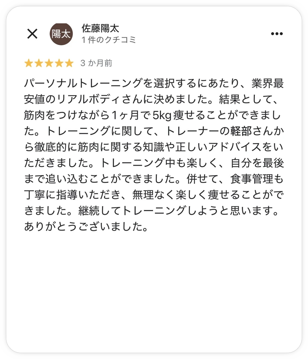 A、ご安心ください!当ジムは【無理な食事制限をしておりません。】また、食事指導は別途料金が発生するジムが多いのですが、当ジムは【食事指導無料】また、ご希望されない場合は食事管理不要も可能です
