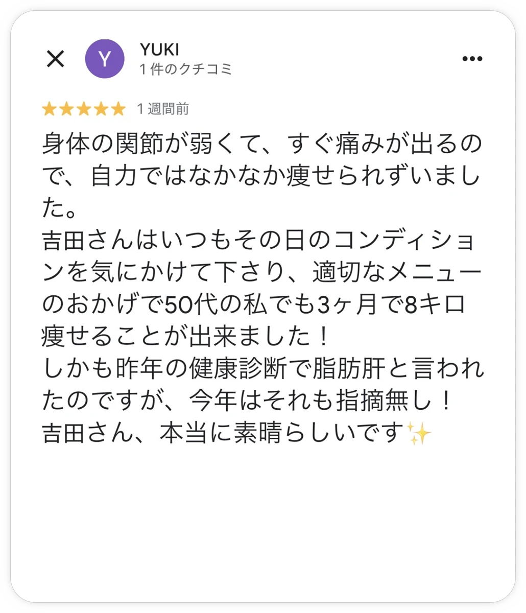 A、もちろんです!!筋トレやスポーツジム、ランニングやヨガを始めても【三日坊主】で終わった。。【モチベーションが続かない】。。そして、結局結果がでない。はっきり言います!!一人で痩せられるのはほんの一握りの方だけです。だからこそ、あなたは一人で頑張らないで下さい。すべて我々にお任せください。あなたが【最短】で痩せる方法を知っていますのできっと継続したくなります!