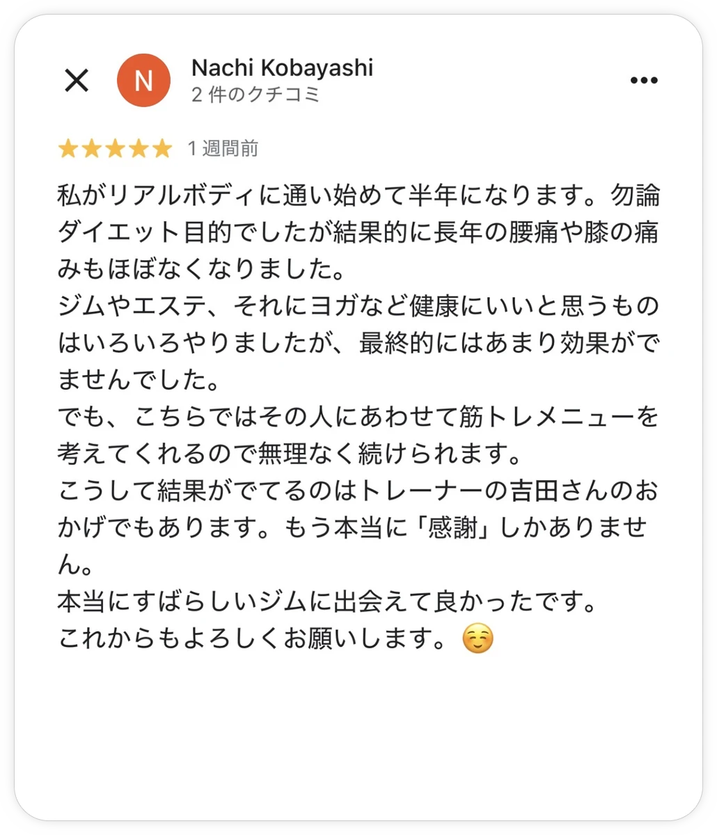 A、もちろん大丈夫です!ほかにも『最近疲れやすい』『肩こり・腰痛・五十肩がある』『健康診断にひっかかった』など、リアルボディではダイエットだけでなく、不調の悩みも解消し、あなたを必ず健康に導きます。