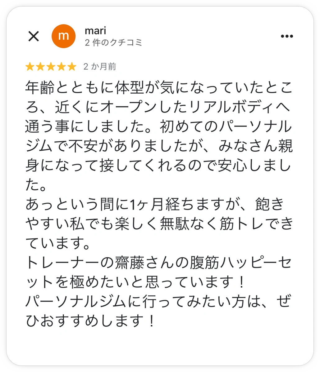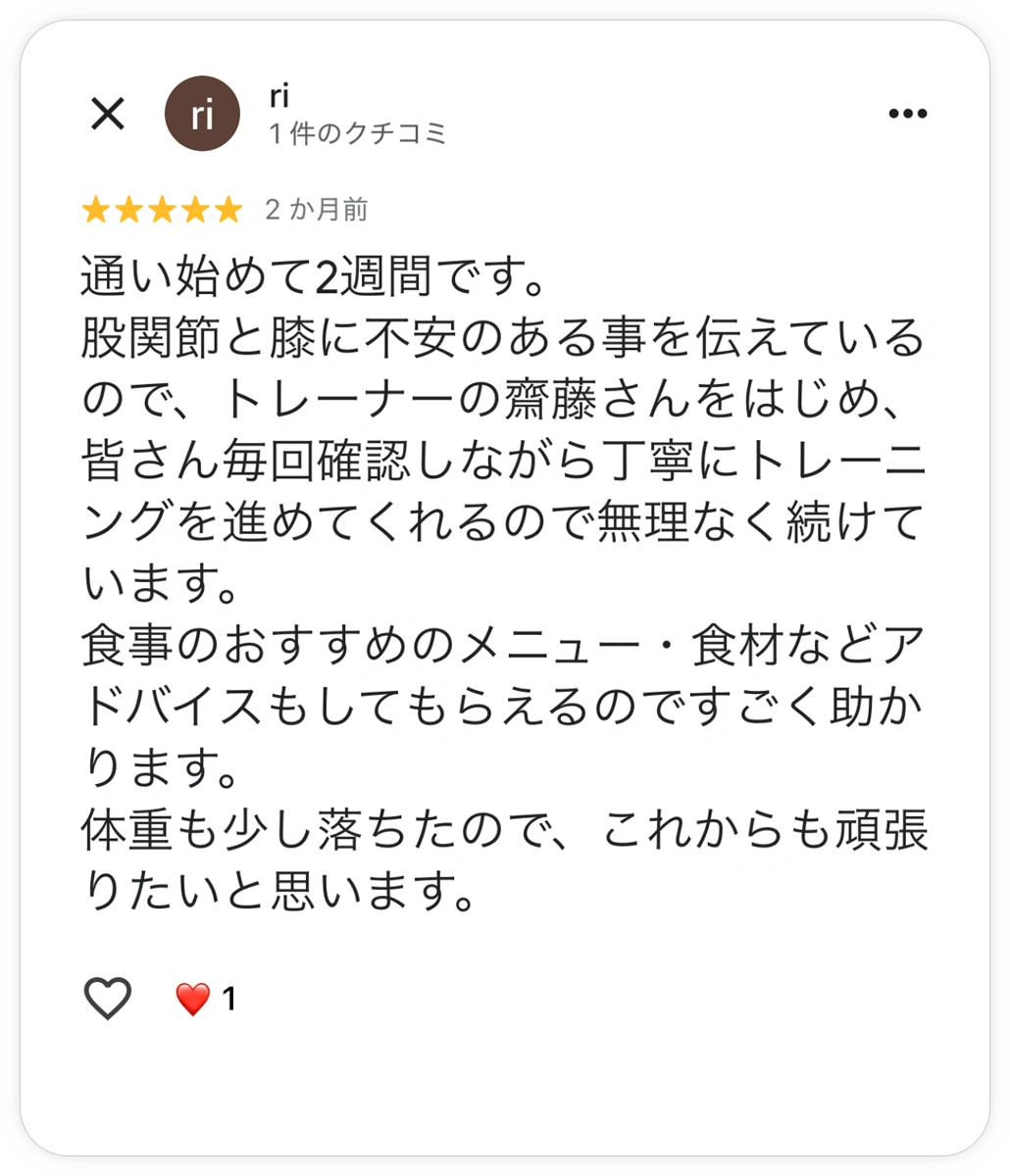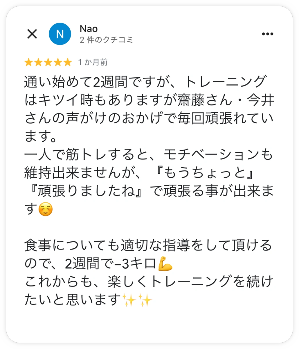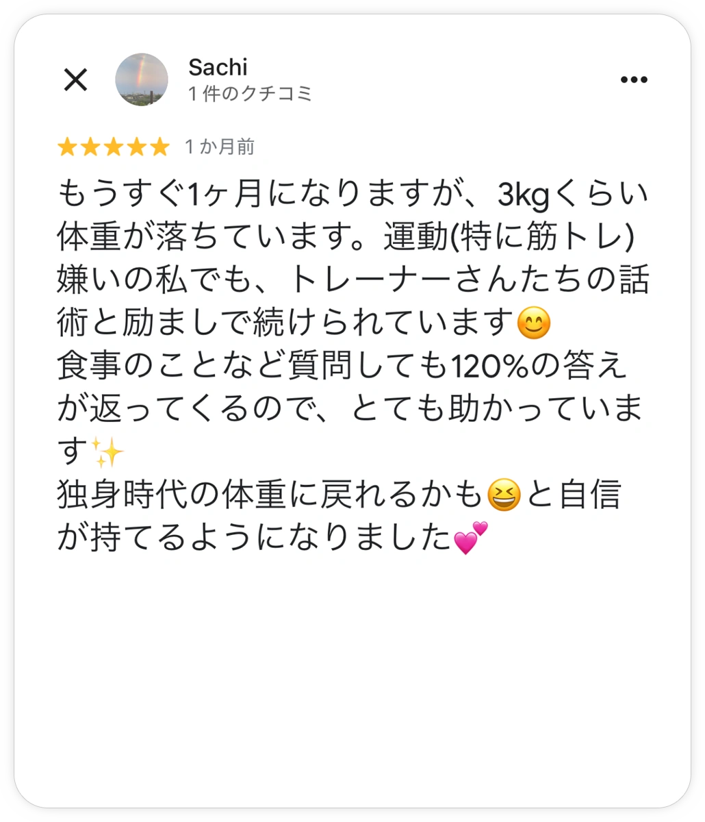 A、気持ちすごくわかります!『ダイエットって辛い』そういうイメージありませんか?もう大丈夫です。ご安心ください!他のお客様でも、最初は同じように【苦手意識】を持たれているいらっしゃる方も多いです。ですが我々は苦手意識を払拭するだけでなく、楽しみながら成果を出せます!二人三脚で一緒に頑張りましょう!