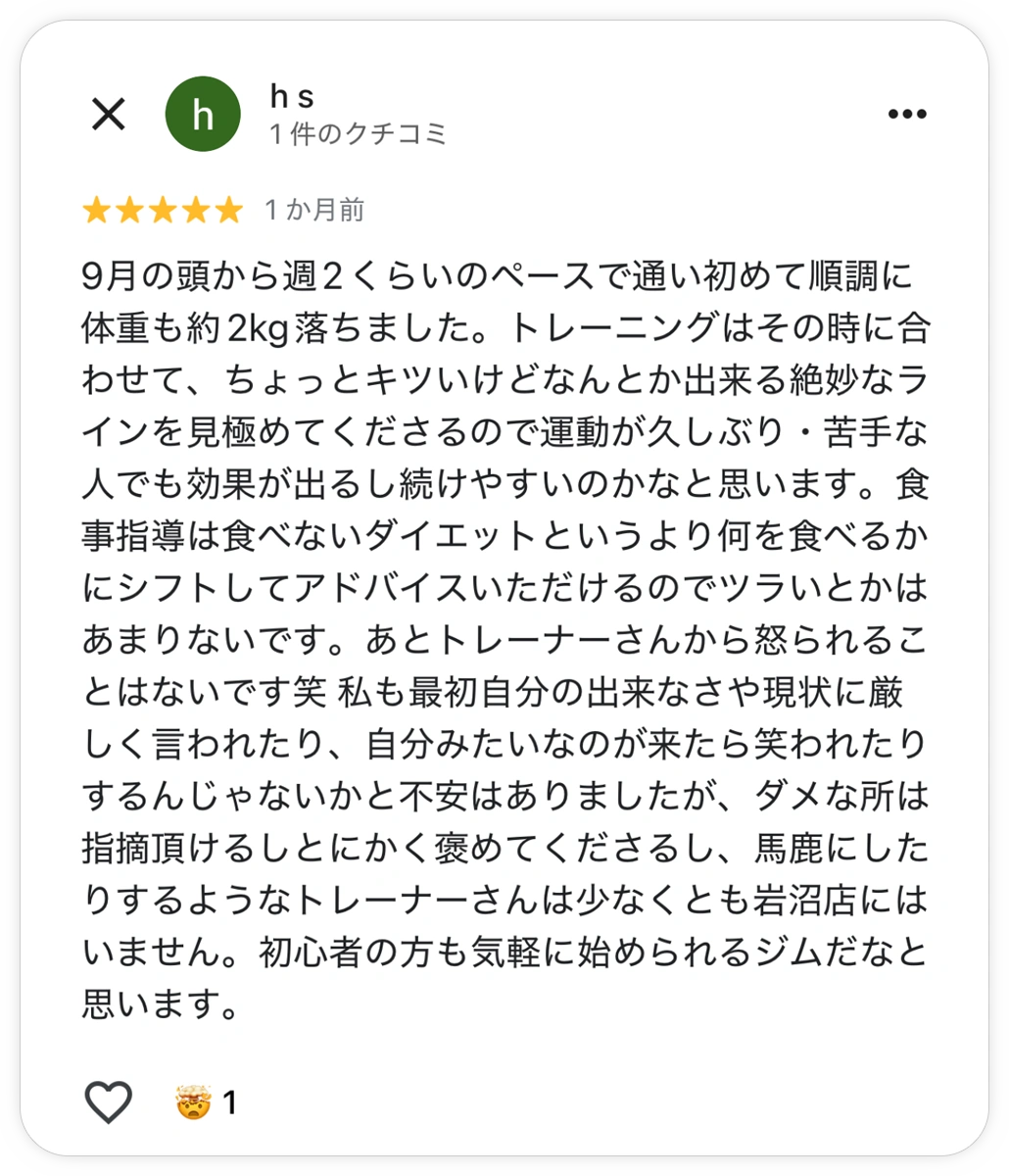 A、ご安心ください!当ジムは【無理な食事制限をしておりません。】また、食事指導は別途料金が発生するジムが多いのですが、当ジムは【食事指導無料】また、ご希望されない場合は食事管理不要も可能です