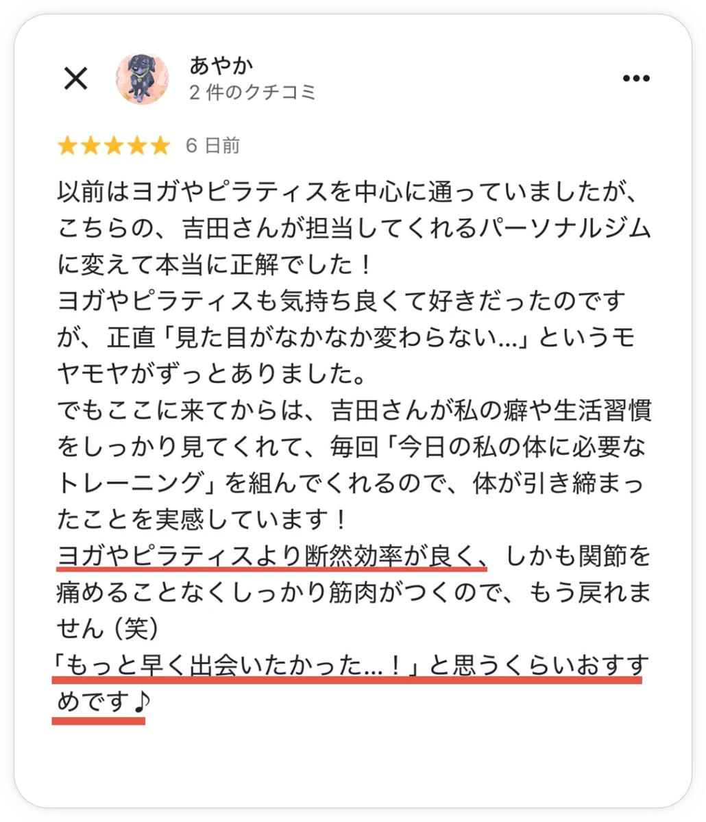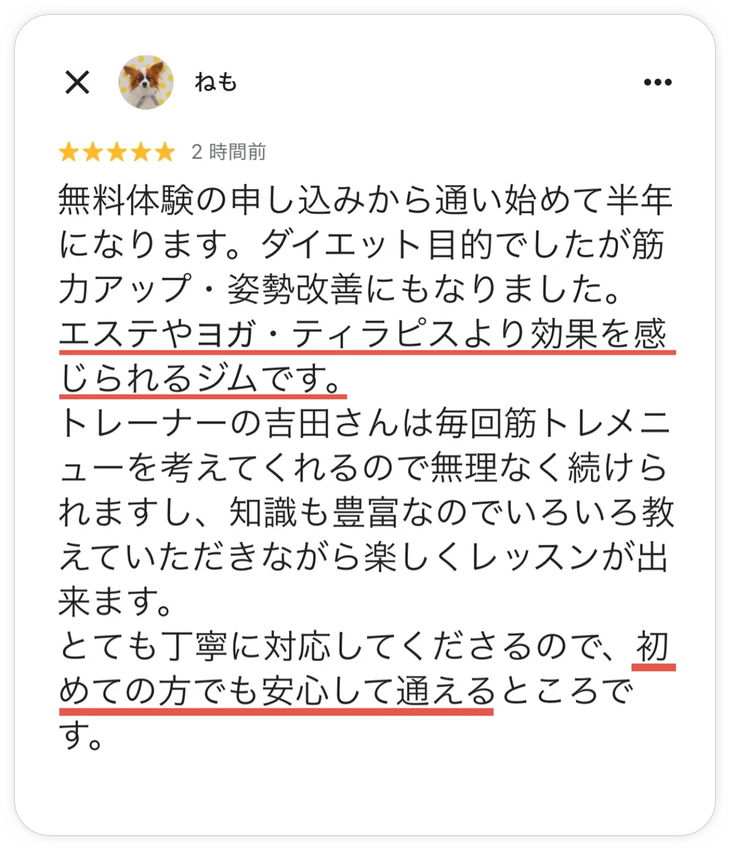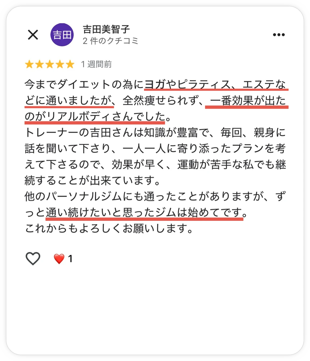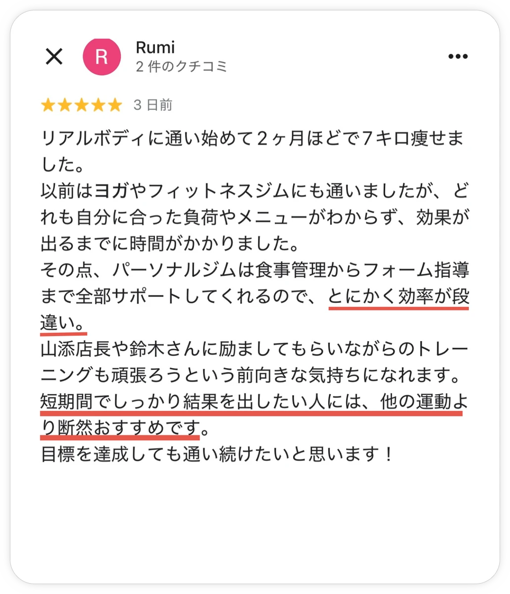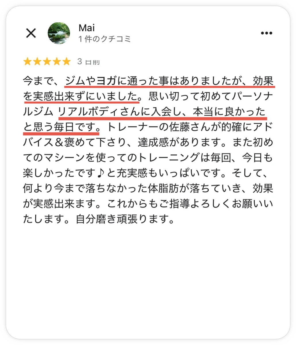 A、気持ちすごくわかります!『ダイエットって辛い』そういうイメージありませんか?もう大丈夫です。ご安心ください!他のお客様でも、最初は同じように【苦手意識】を持たれているいらっしゃる方も多いです。ですが我々は苦手意識を払拭するだけでなく、楽しみながら成果を出せます!二人三脚で一緒に頑張りましょう!