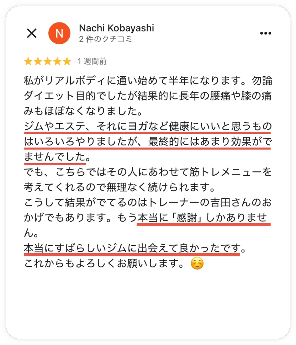 A、もちろん大丈夫です!ほかにも『最近疲れやすい』『肩こり・腰痛・五十肩がある』『健康診断にひっかかった』など、リアルボディではダイエットだけでなく、不調の悩みも解消し、あなたを必ず健康に導きます。