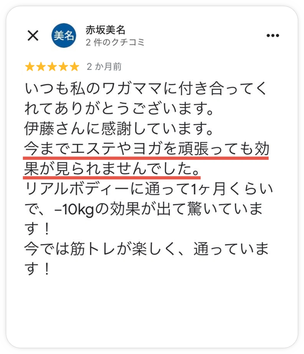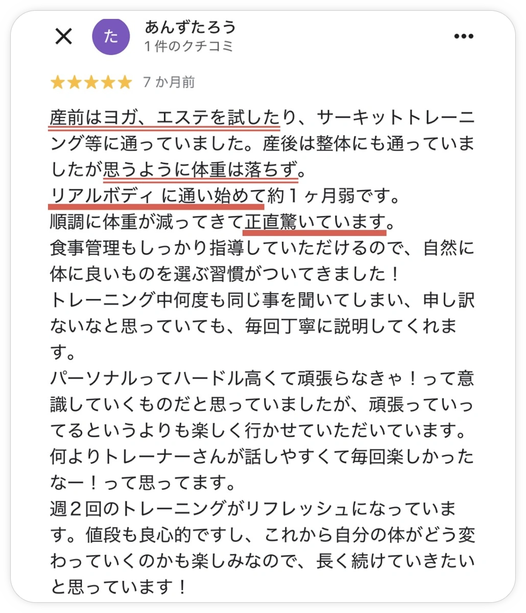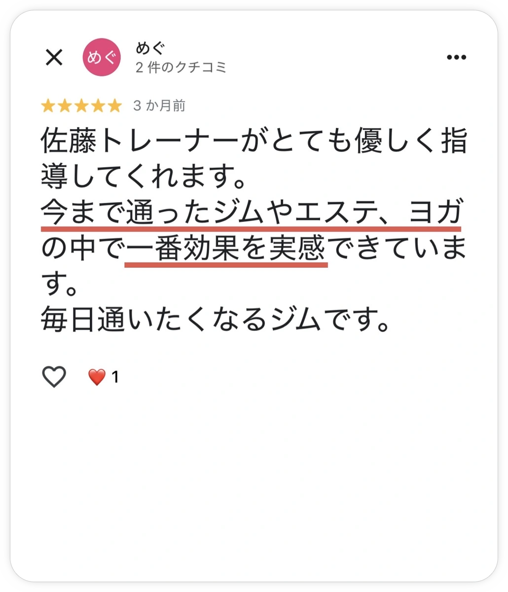 A、気持ちすごくわかります!『ダイエットって辛い』そういうイメージありませんか?もう大丈夫です。ご安心ください!他のお客様でも、最初は同じように【苦手意識】を持たれているいらっしゃる方も多いです。ですが我々は苦手意識を払拭するだけでなく、楽しみながら成果を出せます!二人三脚で一緒に頑張りましょう!
