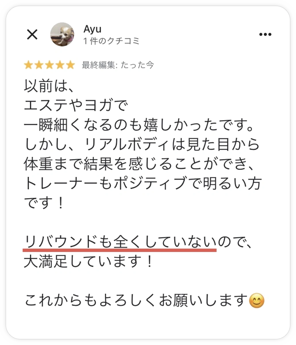 A、【リバウンドしない体作り】が可能!食事制限から解放され、好きなものを好きなだけ食べても理想体型をキープしたくありませんか? ※【リアルボディRグループ限定】のダイエットメソッドとなります。体験時に資料をお見せします。(モザイク処理ご了承ください。)